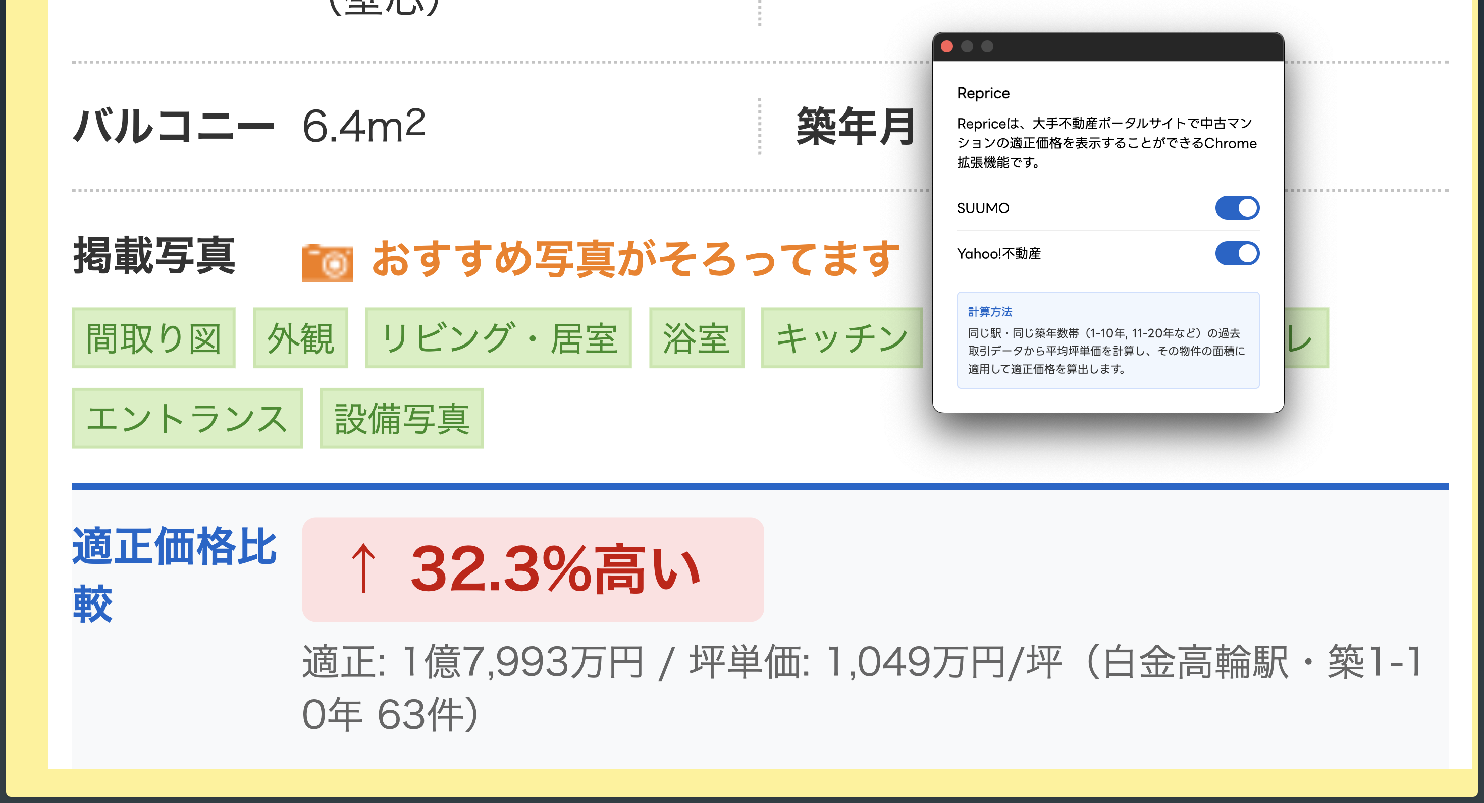A Chrome extension that displays the fair price of used apartments on major real estate portal sites in Japan. The fair price is calculated by determining the average price per tsubo (a unit of area) from past transaction data for properties near the same station and with the same age range (e.g., 1-10 years old, 11-20 years old), and then applying this to the area of the property in question. Repriceは、大手不動産ポータルサイトで中古マンションの適正価格を表示することができるChrome拡張機能です。適正価格は、同じ駅・同じ築年数帯(1-10年, 11-20年など)の過去取引データから平均坪単価を計算し、その物件の面積に適用して算出します。